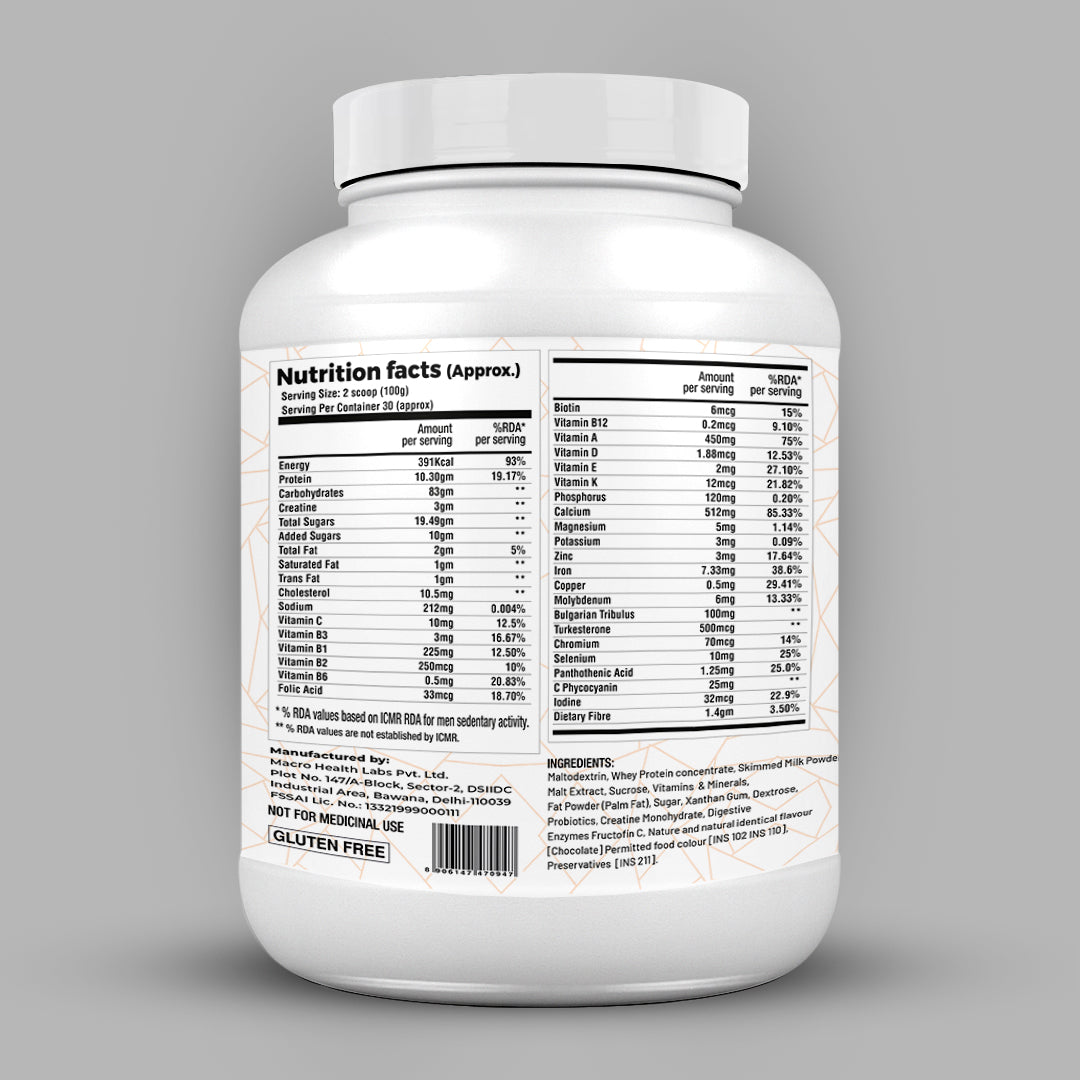Bulk up the right way with CoreMass Chocolate 3kg – your ultimate mass gaining partner. Packed with a powerful blend of high-quality proteins, complex carbohydrates, and essential nutrients, this delicious chocolate-flavored gainer is designed to boost calorie intake, support muscle recovery, and promote lean mass gain.