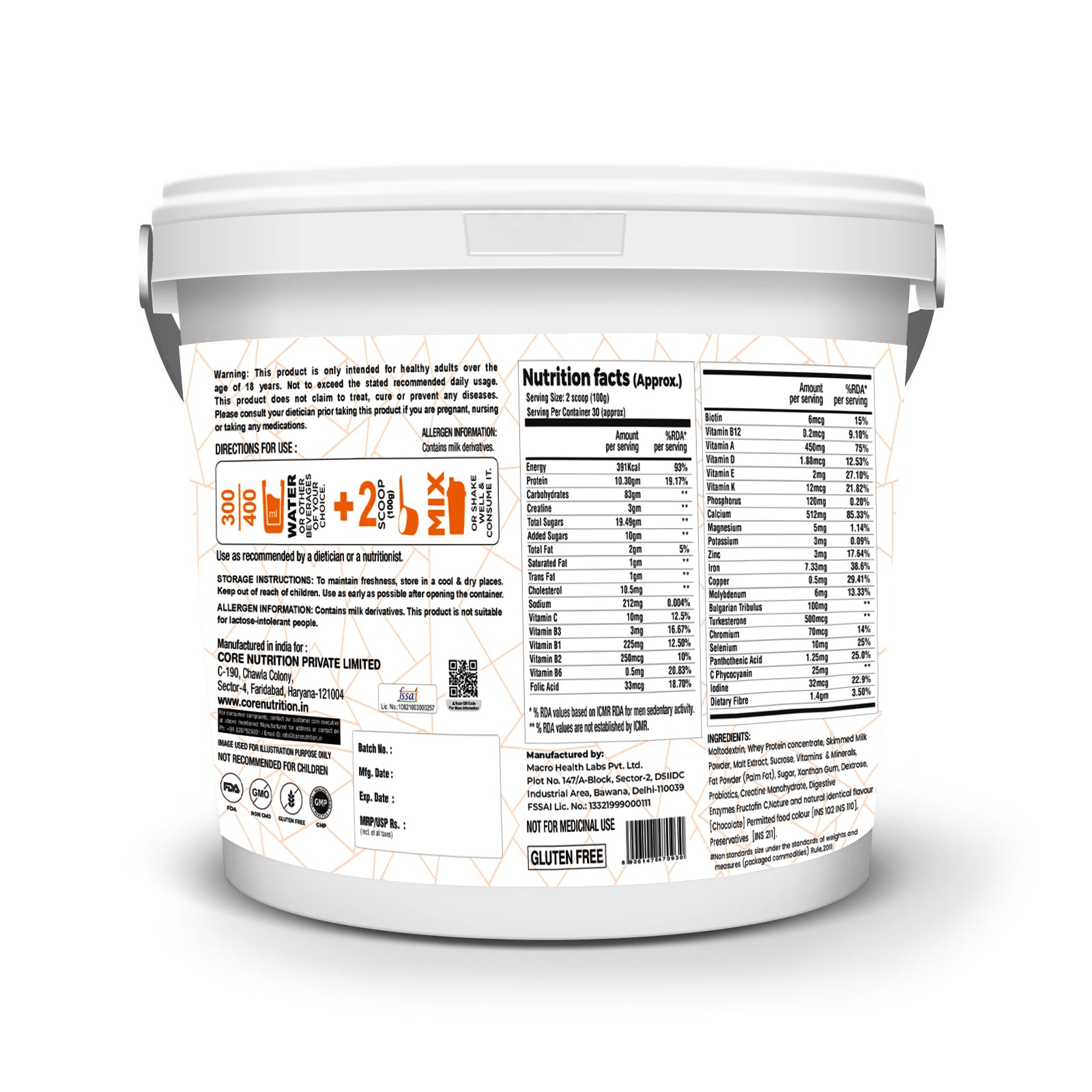 Bulk up the right way with CoreMass Chocolate 3kg – your ultimate mass gaining partner. Packed with a powerful blend of high-quality proteins, complex carbohydrates, and essential nutrients, this delicious chocolate-flavored gainer is designed to boost calorie intake, support muscle recovery, and promote lean mass gain.